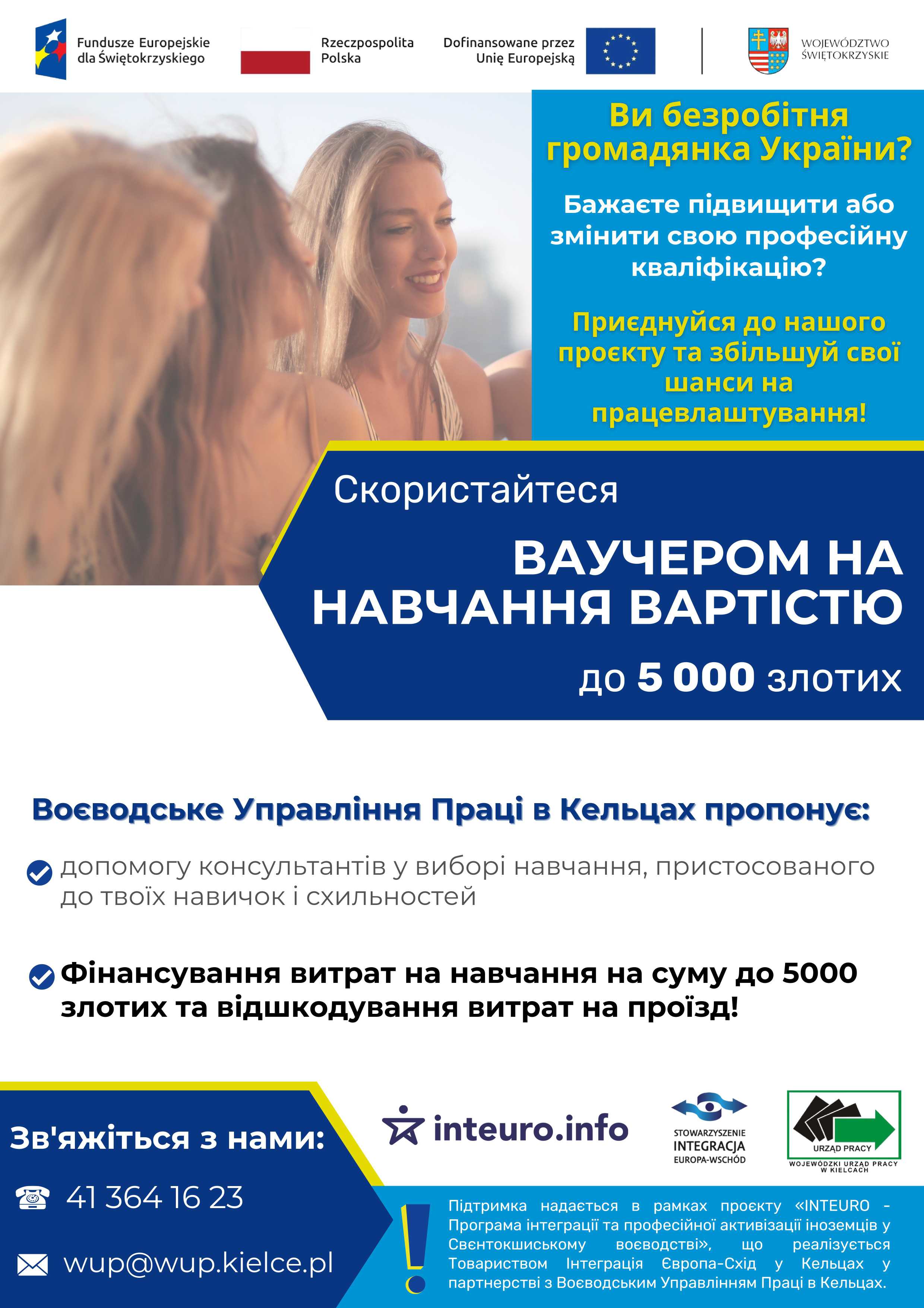 Szybko, merytorycznie i bezpłatnie skorzystaj ze wsparcia udzielanego przez ekspertów Wojewódzkiego Urzędu Pracy w Kielcach, które udzielane jest  dzięki projektowi "INTEURO - program integracji i aktywizacji zawodowej cudzoziemców w województwie Świętokrzyskim"